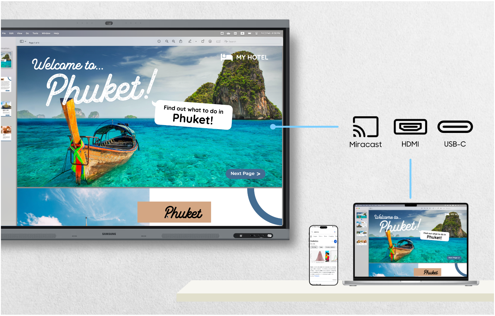 สามารถแชร์หน้าจอได้หลายวิธี ทั้งผ่านสาย HDMI หรือ USB-C Thunderbolt* หรือไร้สาย รองรับทุกอุปกรณ์ทั้ง Windows, Android, iOS, macOS และ iPadOS และแชร์ได้พร้อมกันสูงสุด 9 อุปกรณ์พร้อมกัน